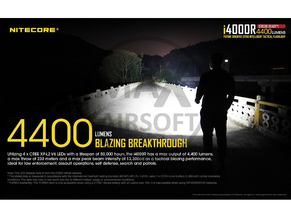 i4000R has an ultra high performance and an extended runtime. The exquisite craftsmanship with the advanced circuit makes it an ideal choice in various tactical and outdoor scenarios. Utilizing 4 x CREE XP-L2 V6 LEDs with a lifespan of 50,000 hours, the i4000R has a max output of 4,400 lumens, a max throw of 230 meters and a max peak beam intensity of 13,300cd as a tactical blazing performance, ideal for law enforcement, assault operations, self defense, search and patrols. The independently controlled quadruple LEDs are powered by a constant current circuit to provide a durable usage with guaranteed safety.