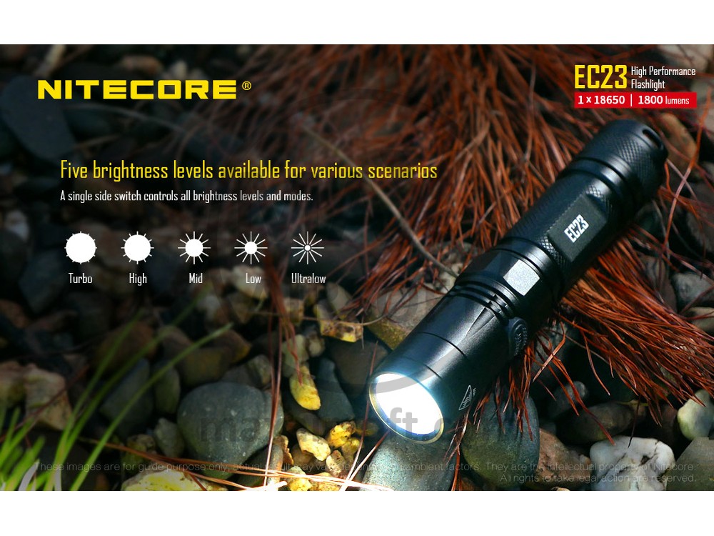 The EC23 is high performance flashlight in a compact size. Compact yet powerful, the EC23 emits scorching 1800 lumens output, powered by only one 18650 Li-ion battery to last for 330 hours, which is your good companions at outdoor or EDC.
