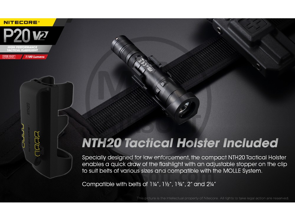 Svjetiljka je opremljena taktičkom torbicom Nitecore NTH20 za sigurnu pohranu te brz i jednostavan pristup kada vam zatreba svjetiljka. Torbica ima podesivu kopču za 1¼", 1½", 1¾", 2" i 2¼". Alternativno, torbica je kompatibilna s Molle sustavima tako da možete sigurno pričvrstiti P20 V2 na svoju opremu.