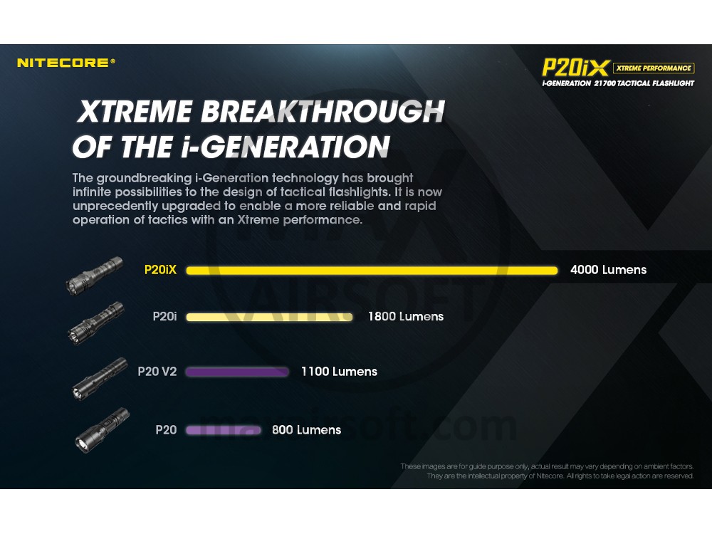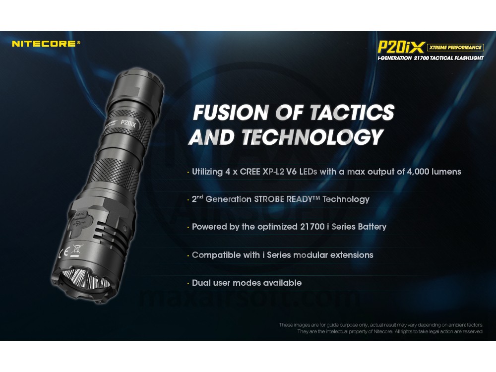Svetilka Nitecore P20iX ima največjo moč 4000 lumnov iz 4 x Cree XP-L2 V6 LED in se napaja iz priložene litij-ionske baterije Nitecore i Series 21700. Svetilko je mogoče polniti preko USB-C priključka na glavi luči. P20iX lahko uporablja tudi 2 celici CR123 za enkratno uporabo, vendar teh ne poskušajte ponovno napolniti.