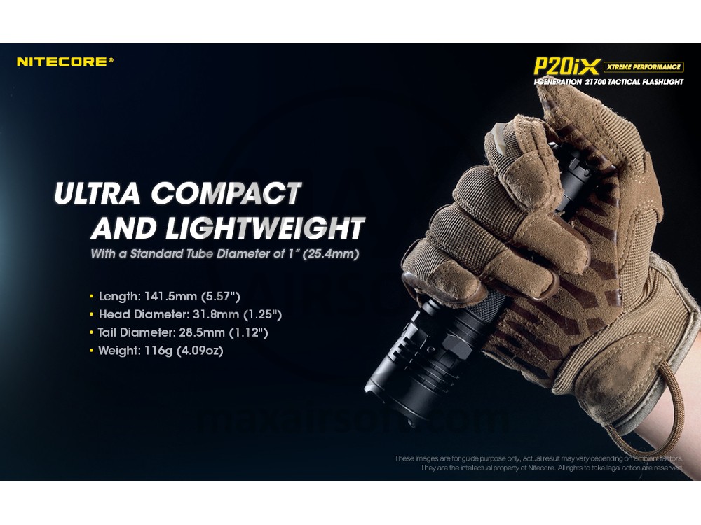 Fantastična vsestranska luč P20iX ima pomnilniško funkcijo, napredno temperaturno regulacijo (ATR), zaščito pred obratno polarnostjo pred udarci in močan okvir. Prihaja tudi z vrsto dodatkov in je združljiv s številnimi dodatnimi dodatki, kot so taktični obroč Nitecore NTR10, 32 mm difuzor, nosilci za pištole in signalna lučka Nitecore TSL10i.